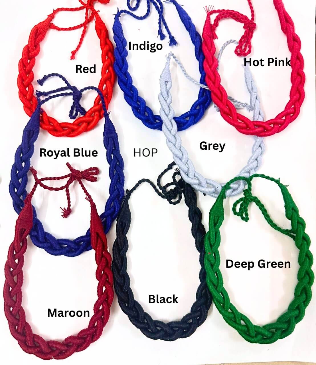 Red, Indigo, Hot Pink, Royal Blue, Grey, Maroon, Black, Deep Green
